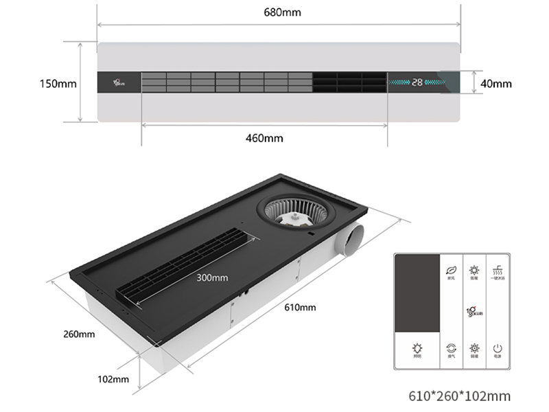 | Функции продукта | Вентиляция, продувка, два скоростного нагрева, выключатель ключа фортепиано, монохромная работа атмосфера, внешнее освещение (на переключателе) (максимальная мощность 200 Вт) |